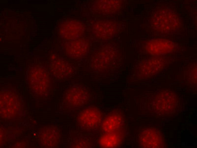 Immunofluorescence staining of methanol-fixed MCF cells using p70 S6 Kinase(Phospho-Thr421) Antibody.