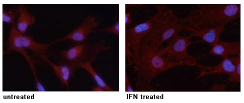 • Immunofluorescence staining of methanol-fixed MEF cells untreated or treated with IFN using STAT3 (Phospho-Tyr705) Antibody.