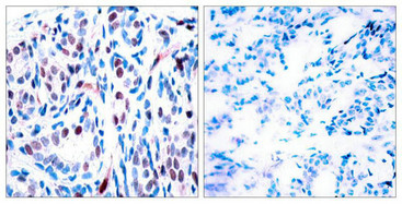 • Immunohistochemical analysis of paraffin-embedded human breast carcinoma tissue using STAT3 (Phospho-Tyr705) Antibody (left) or the same antibody preincubated with blocking peptide (right).