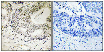 Immunohistochemistry analysis of paraffin-embedded human colon carcinoma tissue using 53BP1 (Phospho-Ser25) antibody. The picture on the right is treated with the synthesized peptide.