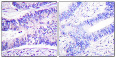 Immunohistochemistry analysis of paraffin-embedded human colon carcinoma tissue using WAVE1 (Phospho-Tyr125) antibody. The picture on the right is treated with the synthesized peptide.
