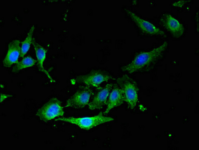 Immunofluorescent analysis of Hela cells using CSB-PA019213EA01HU at dilution of 1: 100 and Alexa Fluor 488-congugated AffiniPure Goat Anti-Rabbit IgG(H+L)