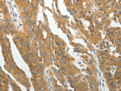The image on the left is immunohistochemistry of paraffin-embedded Human ovarian cancer tissue using CSB-PA237495(RARA Antibody) at dilution 1/40, on the right is treated with fusion protein. (Original magnification: ×200)