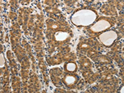 The image on the left is immunohistochemistry of paraffin-embedded Human thyroid cancer tissue using CSB-PA237495(RARA Antibody) at dilution 1/40, on the right is treated with fusion protein. (Original magnification: ×200)