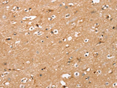 • The image on the left is immunohistochemistry of paraffin-embedded Human brain tissue using CSB-PA574803(RASA3 Antibody) at dilution 1/35, on the right is treated with synthetic peptide. (Original magnification: ×200)