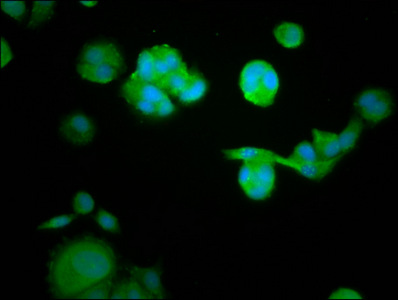 • Immunofluorescence staining of MCF-7 cells with CSB-PA019351LA01HU at 1:105, counter-stained with DAPI. The cells were fixed in 4% formaldehyde, permeabilized using 0.2% Triton X-100 and blocked in 10% normal Goat Serum. The cells were then incubated with the antibody overnight at 4°C. The secondary antibody was Alexa Fluor 488-congugated AffiniPure Goat Anti-Rabbit IgG(H+L).