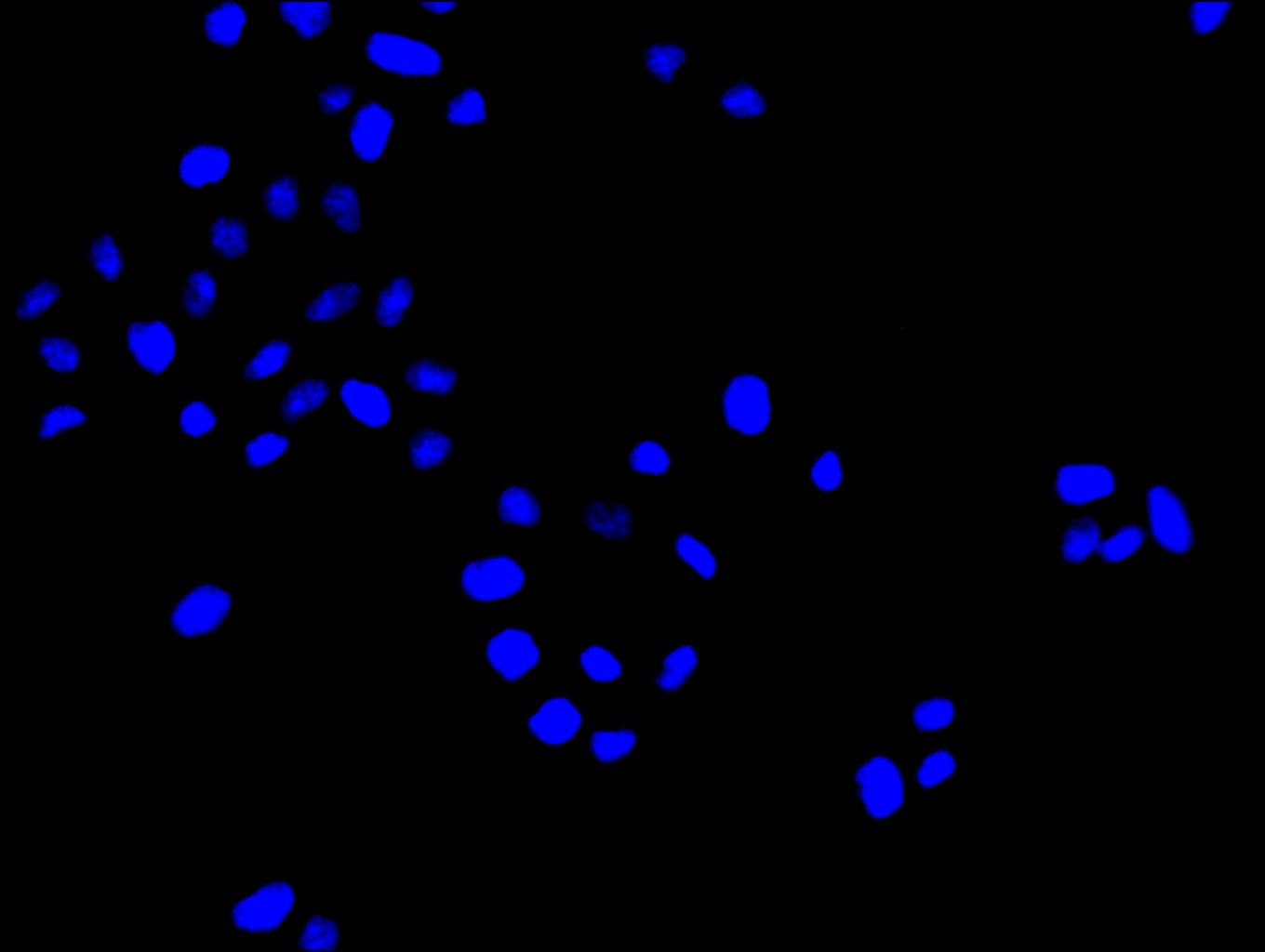 Immunofluorescence staining of Hela cell with 5% goat serum, counter-stained with DAPI. The cells were fixed in 4% formaldehyde and blocked in 10% normal Goat Serum. The cells were then incubated with the antibody overnight at 4C. The secondary antibody was Alexa Fluor 488-congugated AffiniPure Goat Anti-Rabbit IgG(H+L).