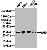 The immunization of rabbits with the recombinant human RHD protein (32-76AA) and final purification from rabbit antiserum by protein G causes the creation of the anti-RHD antibody. This RHD antibody is a polyclonal antibody and occurs as an unconjugated IgG. Its purity is greater than 95%. It is reactive with human and mouse RHD protein, which is the Rh factor antigen of the Rh blood group system and is found on the surface of red blood cells. And this anti-RHD antibody has been validated for use in ELISA, WB, IF, and IHC applications.