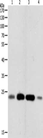 • Gel: 10%SDS-PAGE, Lysate: 40 μg, Lane 1-4: K562 cells, 231 cells, Hela cells, Human fetal brain tissue, Primary antibody: CSB-PA244505(RHOA Antibody) at dilution 1/450, Secondary antibody: Goat anti rabbit IgG at 1/8000 dilution, Exposure time: 3 minutes