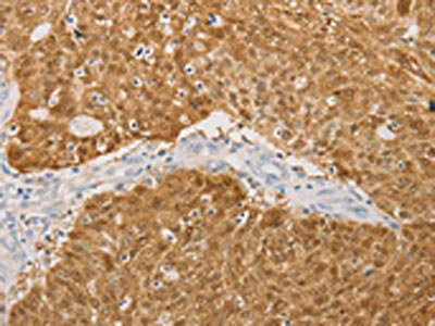 The image on the left is immunohistochemistry of paraffin-embedded Human brain tissue using CSB-PA042178(S100A1 Antibody) at dilution 1/20, on the right is treated with fusion protein. (Original magnification: ×200)