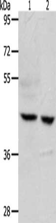 • Gel: 10%SDS-PAGE, Lysate: 40 μg, Lane 1-2: Human brain malignant glioma tissue, MCF7 cells, Primary antibody: CSB-PA971344(S1PR5 Antibody) at dilution 1/750, Secondary antibody: Goat anti rabbit IgG at 1/8000 dilution, Exposure time: 20 seconds