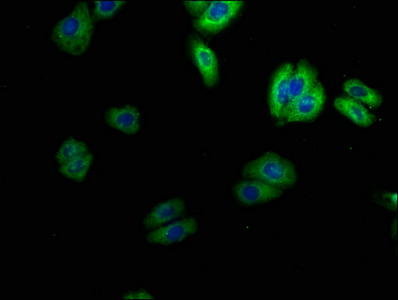 Immunofluorescence staining of HepG2 cells with CSB-PA818246LA01HU at 1:100, counter-stained with DAPI. The cells were fixed in 4% formaldehyde, permeabilized using 0.2% Triton X-100 and blocked in 10% normal Goat Serum. The cells were then incubated with the antibody overnight at 4°C. The secondary antibody was Alexa Fluor 488-congugated AffiniPure Goat Anti-Rabbit IgG(H+L).