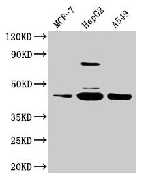 Positive WB detected in: MCF-7 whole cell lysate, HepG2 whole cell lysate, A549 whole cell lysate
