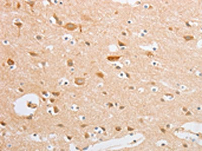 The image on the left is immunohistochemistry of paraffin-embedded Human brain tissue using CSB-PA250447(SERPINE2 Antibody) at dilution 1/20, on the right is treated with fusion protein. (Original magnification: ×200)
