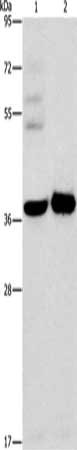 Gel: 8%SDS-PAGE, Lysate: 40 μg, Lane 1-2: A172 cells, human fetal brain tissue, Primary antibody: CSB-PA250447(SERPINE2 Antibody) at dilution 1/450, Secondary antibody: Goat anti rabbit IgG at 1/8000 dilution, Exposure time: 15 seconds