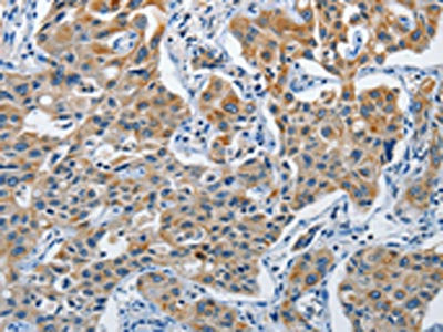 The image on the left is immunohistochemistry of paraffin-embedded Human liver cancer tissue using CSB-PA776362(SGK1 Antibody) at dilution 1/25, on the right is treated with synthetic peptide. (Original magnification: ×200)