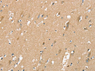 The image on the left is immunohistochemistry of paraffin-embedded Human brain tissue using CSB-PA235687(SIGLEC10 Antibody) at dilution 1/25, on the right is treated with synthetic peptide. (Original magnification: ×200)