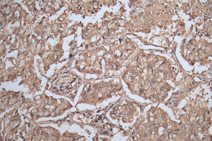 • IHC image of CSB-PA021369ESR2HU diluted at 1:200 and staining in paraffin-embedded human lung cancer performed on a Leica BondTM system. After dewaxing and hydration, antigen retrieval was mediated by high pressure in a citrate buffer (pH 6.0). Section was blocked with 10% normal goat serum 30min at RT. Then primary antibody (1% BSA) was incubated at 4°C overnight. The primary is detected by a Goat anti-rabbit polymer IgG labeled by HRP and visualized using 0.05% DAB.