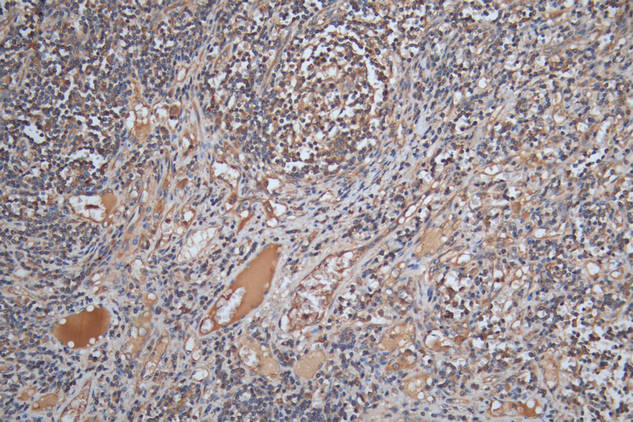 • IHC image of CSB-PA021369ESR2HU diluted at 1:200 and staining in paraffin-embedded human lymph node tissue performed on a Leica BondTM system. After dewaxing and hydration, antigen retrieval was mediated by high pressure in a citrate buffer (pH 6.0). Section was blocked with 10% normal goat serum 30min at RT. Then primary antibody (1% BSA) was incubated at 4°C overnight. The primary is detected by a Goat anti-rabbit polymer IgG labeled by HRP and visualized using 0.05% DAB.