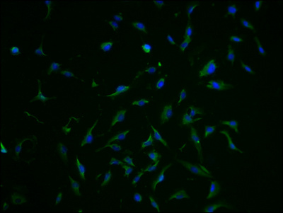 Immunofluorescence staining of U251 cells with CSB-PA021434LA01HU at 1:100, counter-stained with DAPI. The cells were fixed in 4% formaldehyde and blocked in 10% normal Goat Serum. The cells were then incubated with the antibody overnight at 4°C. The secondary antibody was Alexa Fluor 488-congugated AffiniPure Goat Anti-Rabbit IgG(H+L).