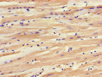 IHC image of CSB-PA021520LA01HU diluted at 1:1200 and staining in paraffin-embedded human heart tissue performed on a Leica BondTM system. After dewaxing and hydration, antigen retrieval was mediated by high pressure in a citrate buffer (pH 6.0). Section was blocked with 10% normal goat serum 30min at RT. Then primary antibody (1% BSA) was incubated at 4°C overnight. The primary is detected by a biotinylated secondary antibody and visualized using an HRP conjugated SP system.