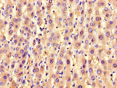 IHC image of CSB-PA021520LA01HU diluted at 1:1200 and staining in paraffin-embedded human liver tissue performed on a Leica BondTM system. After dewaxing and hydration, antigen retrieval was mediated by high pressure in a citrate buffer (pH 6.0). Section was blocked with 10% normal goat serum 30min at RT. Then primary antibody (1% BSA) was incubated at 4°C overnight. The primary is detected by a biotinylated secondary antibody and visualized using an HRP conjugated SP system.