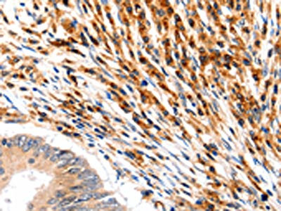 The image on the left is immunohistochemistry of paraffin-embedded Human colon cancer tissue using CSB-PA256733(SLC2A5 Antibody) at dilution 1/12, on the right is treated with synthetic peptide. (Original magnification: ×200)
