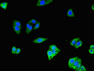 Immunofluorescent analysis of HepG2 cells using CSB-PA868355LA01HU at dilution of 1:100 and Alexa Fluor 488-congugated AffiniPure Goat Anti-Rabbit IgG(H+L)
