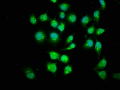 Immunofluorescence staining of Hela cells with CSB-PA618998LA01HU at 1:200, counter-stained with DAPI. The cells were fixed in 4% formaldehyde, permeabilized using 0.2% Triton X-100 and blocked in 10% normal Goat Serum. The cells were then incubated with the antibody overnight at 4°C. The secondary antibody was Alexa Fluor 488-congugated AffiniPure Goat Anti-Rabbit IgG(H+L).