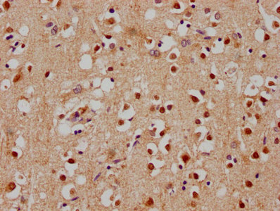 IHC image of CSB-PA022418OA01HU diluted at 1:100 and staining in paraffin-embedded human brain tissue performed on a Leica BondTM system. After dewaxing and hydration, antigen retrieval was mediated by high pressure in a citrate buffer (pH 6.0). Section was blocked with 10% normal goat serum 30min at RT. Then primary antibody (1% BSA) was incubated at 4°C overnight. The primary is detected by a biotinylated secondary antibody and visualized using an HRP conjugated SP system.