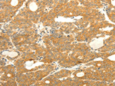 The image on the left is immunohistochemistry of paraffin-embedded Human thyroid cancer tissue using CSB-PA698932(SOX2 Antibody) at dilution 1/25, on the right is treated with fusion protein. (Original magnification: ×200)