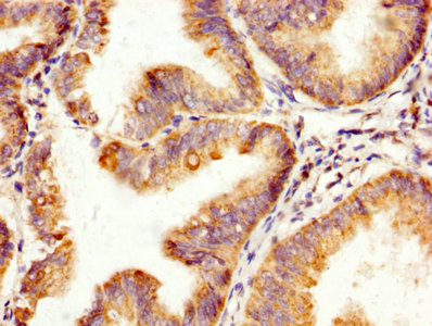 IHC image of CSB-PA12124A0Rb diluted at 1:200 and staining in paraffin-embedded human endometrial cancer performed on a Leica BondTM system. After dewaxing and hydration, antigen retrieval was mediated by high pressure in a citrate buffer (pH 6.0). Section was blocked with 10% normal goat serum 30min at RT. Then primary antibody (1% BSA) was incubated at 4°C overnight. The primary is detected by a biotinylated secondary antibody and visualized using an HRP conjugated SP system.