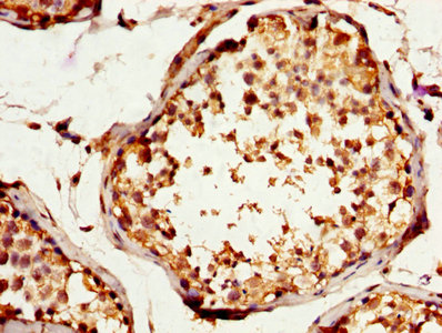 IHC image of CSB-PA12124A0Rb diluted at 1:200 and staining in paraffin-embedded human testis tissue performed on a Leica BondTM system. After dewaxing and hydration, antigen retrieval was mediated by high pressure in a citrate buffer (pH 6.0). Section was blocked with 10% normal goat serum 30min at RT. Then primary antibody (1% BSA) was incubated at 4°C overnight. The primary is detected by a biotinylated secondary antibody and visualized using an HRP conjugated SP system.