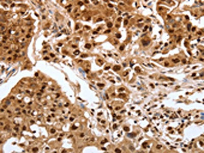 The image on the left is immunohistochemistry of paraffin-embedded Human lung cancer tissue using CSB-PA555646(SRF Antibody) at dilution 1/30, on the right is treated with synthetic peptide. (Original magnification: ×200)