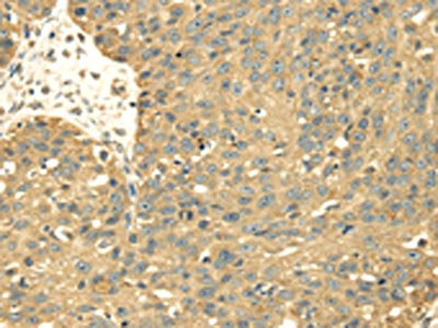 The image on the left is immunohistochemistry of paraffin-embedded Human thyroid cancer tissue using CSB-PA507142(SRPRB Antibody) at dilution 1/30, on the right is treated with fusion protein. (Original magnification: ×200)