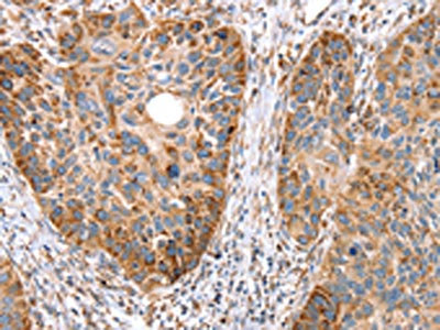 The image on the left is immunohistochemistry of paraffin-embedded Human esophagus cancer tissue using CSB-PA044833(SSBP1 Antibody) at dilution 1/20, on the right is treated with fusion protein. (Original magnification: ×200)