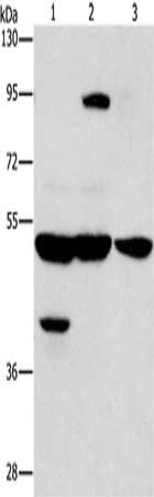 Gel: 6%SDS-PAGE, Lysate: 40 μg, Lane 1-3: Human bladder carcinoma tissue, A172 cells, human brain malignant glioma tissue, Primary antibody: CSB-PA192084(STK3/STK4 Antibody) at dilution 1/1000, Secondary antibody: Goat anti rabbit IgG at 1/8000 dilution, Exposure time: 10 seconds