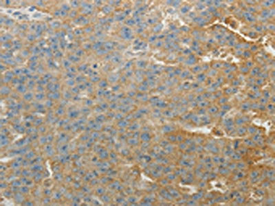 The image on the left is immunohistochemistry of paraffin-embedded Human liver cancer tissue using CSB-PA124064(SULT1E1 Antibody) at dilution 1/30, on the right is treated with fusion protein. (Original magnification: ×200)