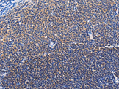 The image on the left is immunohistochemistry of paraffin-embedded Human lymphoma tissue using CSB-PA832352(SYK Antibody) at dilution 1/20, on the right is treated with fusion protein. (Original magnification: ×200)