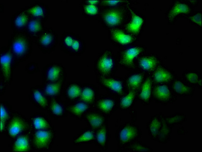 Immunofluorescence staining of Hela cells with CSB-PA752101LA01HU at 1:100, counter-stained with DAPI. The cells were fixed in 4% formaldehyde, permeabilized using 0.2% Triton X-100 and blocked in 10% normal Goat Serum. The cells were then incubated with the antibody overnight at 4°C. The secondary antibody was Alexa Fluor 488-congugated AffiniPure Goat Anti-Rabbit IgG(H+L).