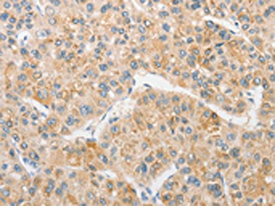 The image on the left is immunohistochemistry of paraffin-embedded Human liver cancer tissue using CSB-PA296982(TLR5 Antibody) at dilution 1/30, on the right is treated with fusion protein. (Original magnification: ×200)
