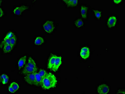 • Immunofluorescent analysis of MCF-7 cells using CSB-PA03899A0Rb at dilution of 1:100 and Alexa Fluor 488-congugated AffiniPure Goat Anti-Rabbit IgG(H+L)