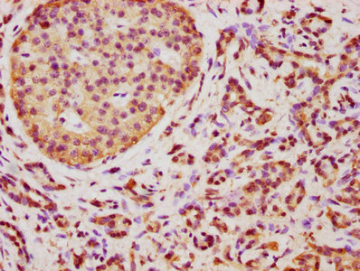 • IHC image of CSB-PA023720LA01HU diluted at 1:350 and staining in paraffin-embedded human pancreatic cancer performed on a Leica BondTM system. After dewaxing and hydration, antigen retrieval was mediated by high pressure in a citrate buffer (pH 6.0). Section was blocked with 10% normal goat serum 30min at RT. Then primary antibody (1% BSA) was incubated at 4°C overnight. The primary is detected by a biotinylated secondary antibody and visualized using an HRP conjugated SP system.
