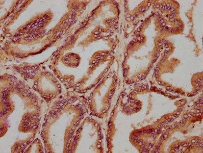 IHC image of CSB-PA023891LA01HU diluted at 1:400 and staining in paraffin-embedded human prostate tissue performed on a Leica BondTM system. After dewaxing and hydration, antigen retrieval was mediated by high pressure in a citrate buffer (pH 6.0). Section was blocked with 10% normal goat serum 30min at RT. Then primary antibody (1% BSA) was incubated at 4°C overnight. The primary is detected by a biotinylated secondary antibody and visualized using an HRP conjugated SP system.