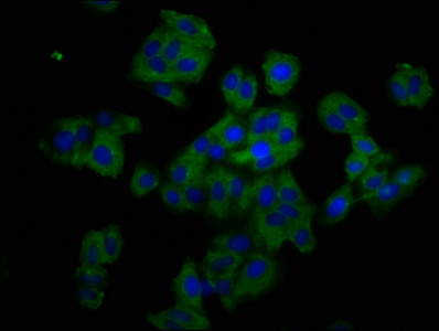Immunofluorescence staining of HepG2 cells with CSB-PA878878LA01HU at 1:200, counter-stained with DAPI. The cells were fixed in 4% formaldehyde, permeabilized using 0.2% Triton X-100 and blocked in 10% normal Goat Serum. The cells were then incubated with the antibody overnight at 4°C. The secondary antibody was Alexa Fluor 488-congugated AffiniPure Goat Anti-Rabbit IgG(H+L).