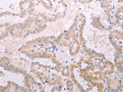 • The image on the left is immunohistochemistry of paraffin-embedded Human thyroid cancer tissue using CSB-PA169016(TPO Antibody) at dilution 1/50, on the right is treated with fusion protein. (Original magnification: ×200)