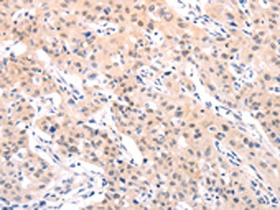 • The image on the left is immunohistochemistry of paraffin-embedded Human lung cancer tissue using CSB-PA034758(TRAF2 Antibody) at dilution 1/40, on the right is treated with fusion protein. (Original magnification: ×200)