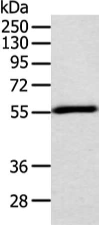 • Gel: 8%SDS-PAGE, Lysate: 40 μg, Lane: Human normal liver tissue, Primary antibody: CSB-PA034758(TRAF2 Antibody) at dilution 1/200 dilution, Secondary antibody: Goat anti rabbit IgG at 1/8000 dilution, Exposure time: 2 minutes