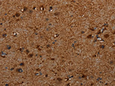 • The image on the left is immunohistochemistry of paraffin-embedded Human brain tissue using CSB-PA037727(TRPV1 Antibody) at dilution 1/20, on the right is treated with synthetic peptide. (Original magnification: ×200)