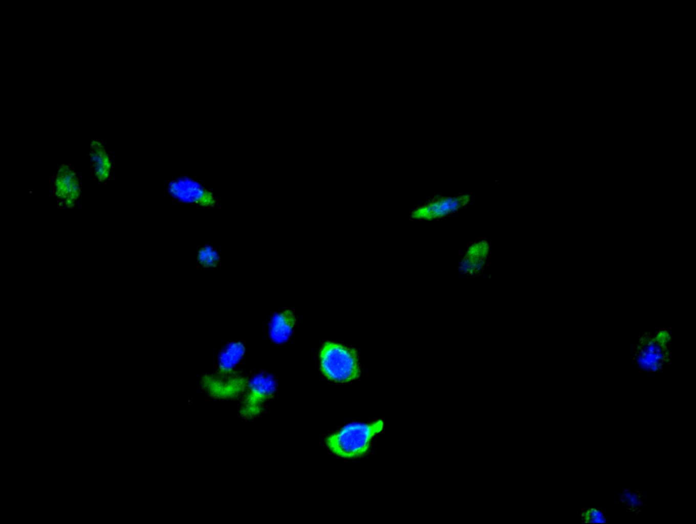 • Immunofluorescence staining of A549 cell with CSB-PA025152LA01HU at 1:30, counter-stained with DAPI. The cells were fixed in 4% formaldehyde and blocked in 10% normal Goat Serum. The cells were then incubated with the antibody overnight at 4C. The secondary antibody was Alexa Fluor 488-congugated AffiniPure Goat Anti-Rabbit IgG(H+L).